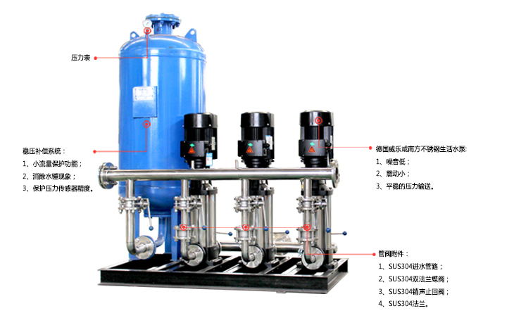 设定参数,通过微机控制变频器的输出频率从而自动调节水泵电机的转速,实现管网水压系统自动恒稳于设定的压力值:即用水量增加时,频率升高,水泵转速加快,供水量相应增大;用水量减少时,频率降低,水泵转速减慢,供水量亦相应减小,这样就保证了供水效率用户对水压和水量的要求,同时达到了提高供水品质和供水效率的目的,“用多少水,供多少水”;采用该设备不需建造高位水箱,水塔,水质无二次污染,是一种理想的现代化建筑供水设备。设备还具有远程(无线)通信监控功能及用户中控室(选配);人性化的人机对话触摸式界面;全人工智能控制及远程保修预警服务。